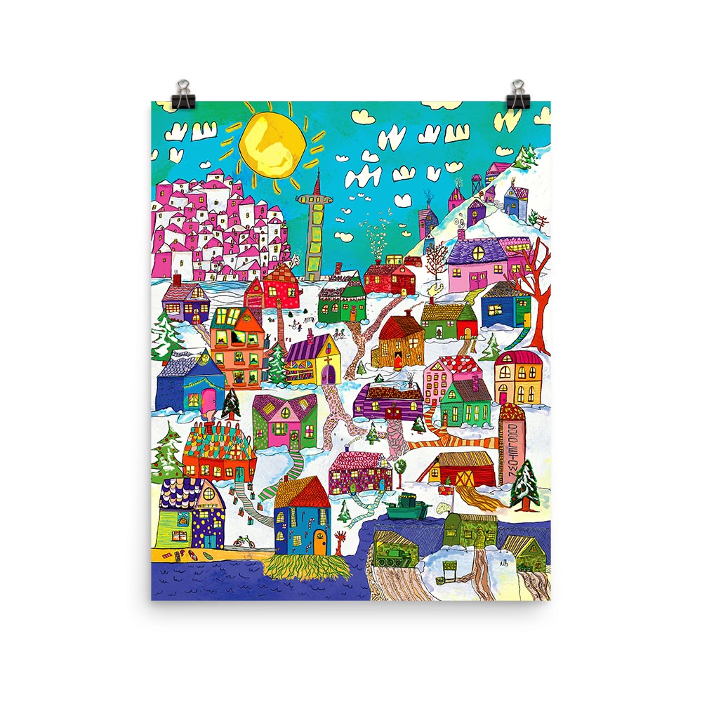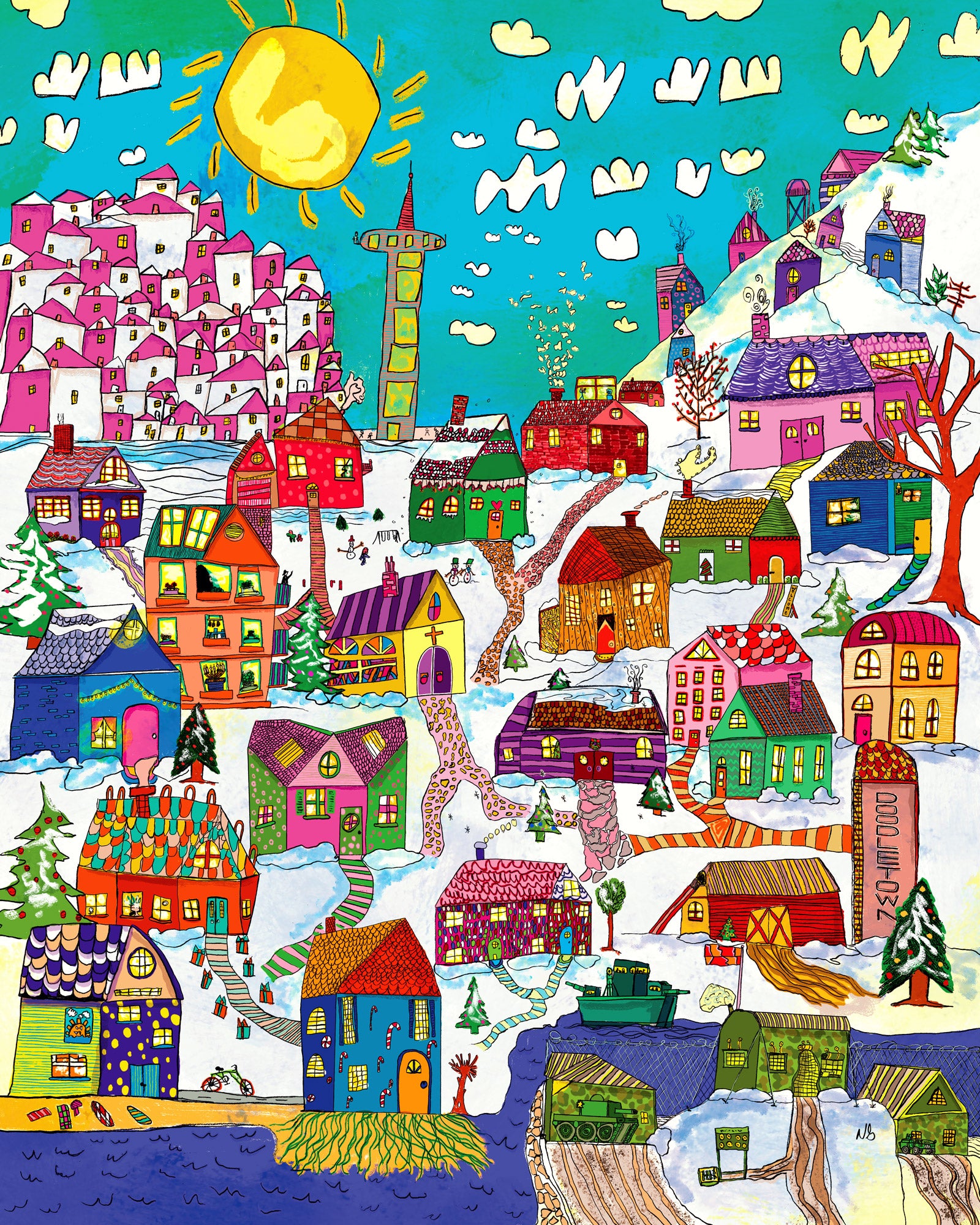 I’m very excited to share the Doodletown which I created with the Grade 5 students at Longue Sault Public School in my hometown of Long Sault, Ontario. This dreamy Christmas town was very fun to make and the children proved to all be natural artists!